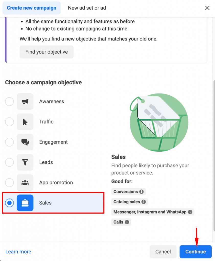 In the pop-up window, select the Sales campaign objective, and then click Continue.